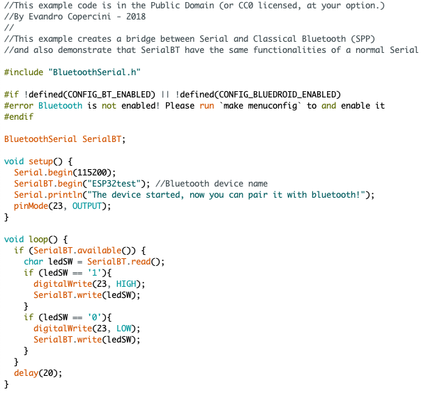 소스코드는 SerialToSerialBT라는 샘플을 기본으로 이용하였다.