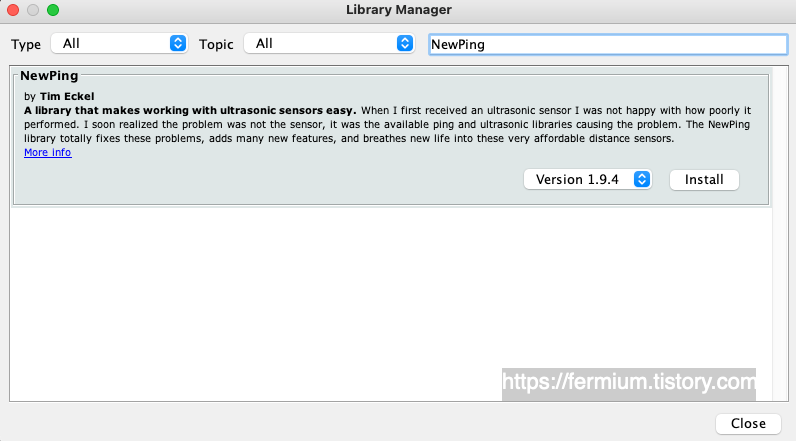 아래의 사진과 같이 [NewPing] 이라는 라이브러리를